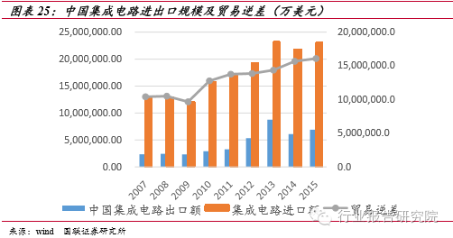 國(guó)內(nèi)需求充足,進(jìn)口替代空間巨大。中國(guó)集成電路市場(chǎng)規(guī)模雖然大,但不可回避的問(wèn)題是其自給率偏低。據(jù)海關(guān)統(tǒng)計(jì),2015 年中國(guó)集成電路進(jìn)口金額比去年同期增長(zhǎng)6%,達(dá)到2307億美元,而出口金額為僅為693.1億美元,進(jìn)出口逆差仍然有1613.9億美元,這表明國(guó)內(nèi)有極大的進(jìn)口替代空間。