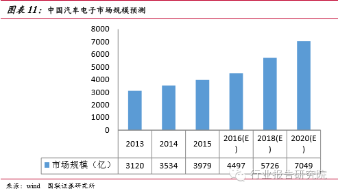 汽車(chē)電子類(lèi)產(chǎn)品通常落后消費(fèi)類(lèi)電子產(chǎn)品一個(gè)時(shí)期,正如過(guò)去幾年手機(jī)行業(yè)所經(jīng)歷的那樣,汽車(chē)業(yè)正在由“功能機(jī)”向“智能機(jī)”發(fā)展,這將給電子行業(yè)帶來(lái)新的增長(zhǎng)引擎。受惠于各國(guó)汽車(chē)安全政策加持,近期汽車(chē)電子輔助行車(chē)安全的趨勢(shì)已十分明確,越來(lái)越多類(lèi)似TPMS、倒車(chē)影像、自動(dòng)剎車(chē)系統(tǒng)等新應(yīng)用崛起。各大車(chē)企、互聯(lián)網(wǎng)公司紛紛加快在車(chē)聯(lián)網(wǎng)和自動(dòng)駕駛領(lǐng)域的產(chǎn)業(yè)布局,車(chē)聯(lián)網(wǎng)有望成為第一個(gè)實(shí)現(xiàn)的物聯(lián)網(wǎng)應(yīng)用空間廣闊,存量與增量汽車(chē)市場(chǎng)規(guī)??捎^。2015 年中國(guó)汽車(chē)電子市場(chǎng)規(guī)模為3,979億元,同比增長(zhǎng)12.6%,2013~2015年中國(guó)汽車(chē)電子市場(chǎng)規(guī)模平均增長(zhǎng)率為13.7% 。中商產(chǎn)業(yè)研究院預(yù)測(cè)2016年中國(guó)汽車(chē)電子市場(chǎng)規(guī)模為4497億元。賽迪顧問(wèn)預(yù)計(jì)到2016年中國(guó)汽車(chē)電子市場(chǎng)將保持 10%以上的增速,同時(shí)汽車(chē)電子在整車(chē)成本中的占比將超過(guò)50% 。我們判斷中國(guó)汽車(chē)電子市場(chǎng)增長(zhǎng)方式正在由汽車(chē)產(chǎn)量增長(zhǎng)轉(zhuǎn)向功能需求驅(qū)動(dòng)。